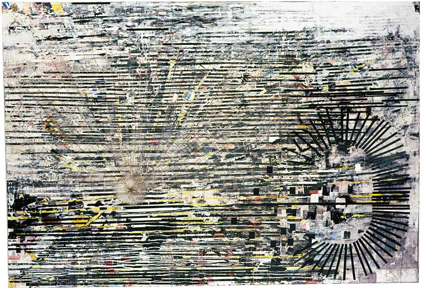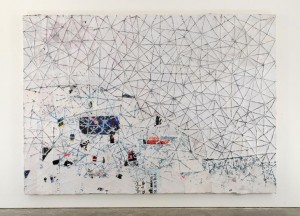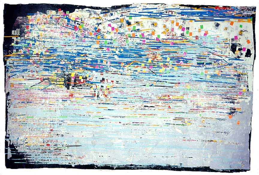 Artist Mark Bradford incorporates remnants of found posters and billboards along with stencils and logos to represent networks that emerge within a city. Bradford transforms materials scavenged from the street into wall-sized collages and installations that respond to underground economies, migrant communities, or popular appropriation of abandoned public space.