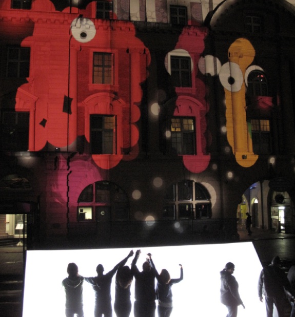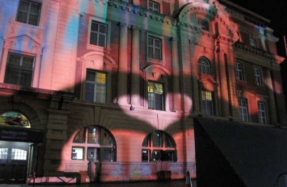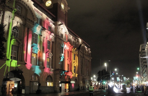 “In this installation YesYesNo teamed up with The Church, Inside Out Productions and Electric Canvas to turn the Auckland Ferry Building into an interactive playground. Their job was to create an installation that would go beyond merely projection on buildings and allow viewers to become performers, by taking their body movements and amplifying them 5 stories tall.”