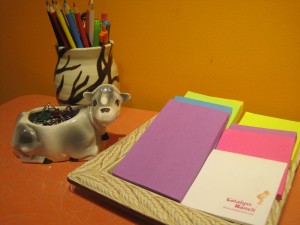 Owl pen holder with cool colored pens & pencils,ceramic tray with post-its, cow with binder clips!