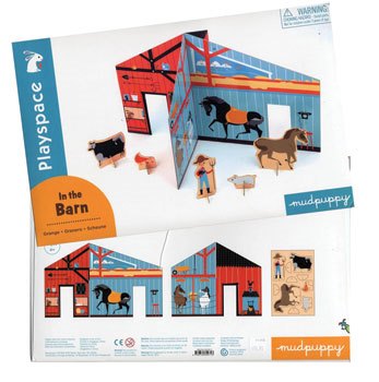 This October, it’s time for some farm fun at the Ranch! Mudpuppy’s In the Barn Playspace has two interlocking slotted pieces that fit together to create four play areas for 5 play figures. Valeria Cis has illustrated the walls of the barn to show horses in their stalls, a hayloft, tools like pitchforks and spades, rabbits in their cozy pens, a bird, a spider, a resident mouse, and even a barn owl. The figures show a farmer holding a cat and a pitchfork, a cow, a horse, a pig, and a mother hen and her chicks. E-I-E-I-O!